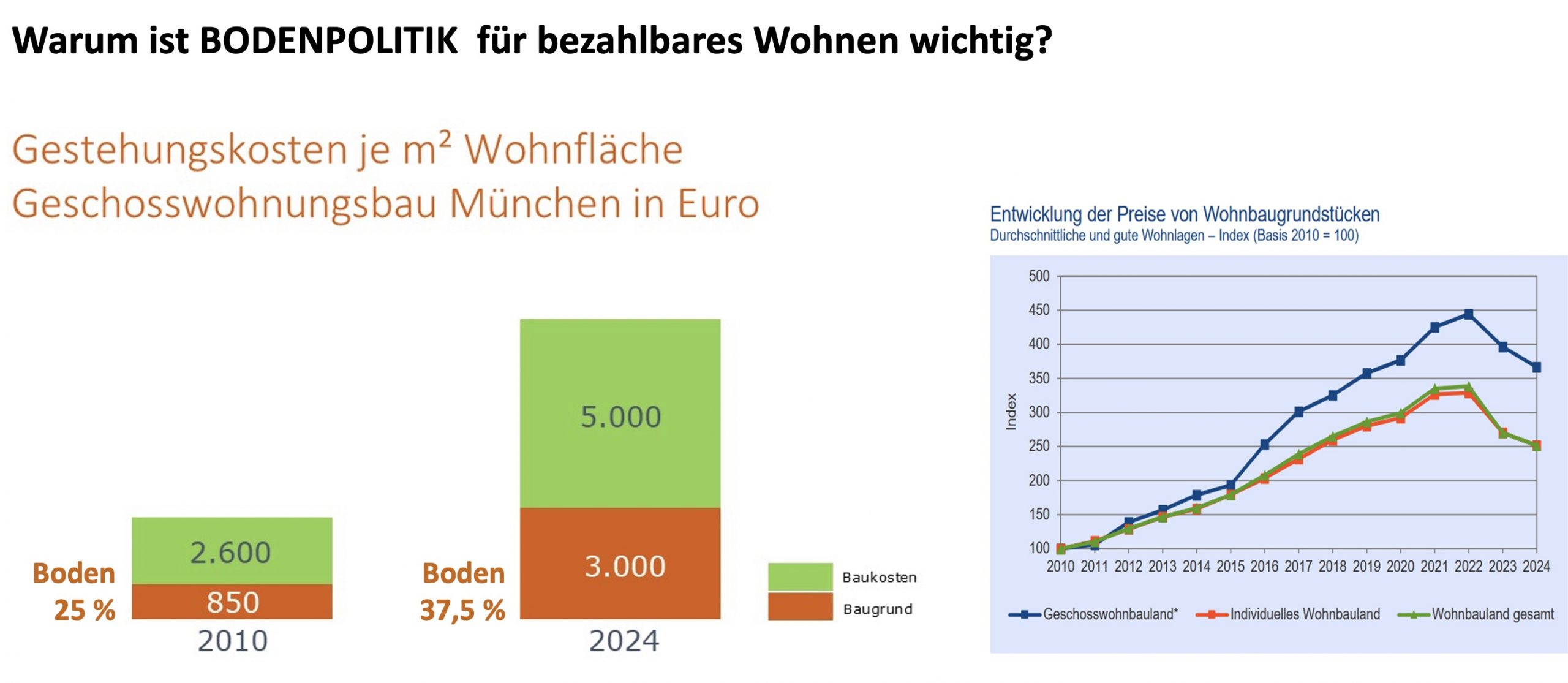 Das Bauland in den Städten erlebte in der langen Niedrigzinsphase nach der Weltfinanzkrise einen ähnlichen Goldrausch, der den Mangel an bezahlbaren Wohnungen verschärfte. Bauland für Mehrfamilienhäuser kostete 2022 in Regionen mit hohem Bodenpreisniveau 1.140 Euro pro m² und damit mehr als dreimal so viel wie 2009, in attraktiven Großstädten wie München sogar fast fünfmal so viel (AK OGA 2023: 185). Bei Bodenanteilen, die bis zu 80 % der Herstellungskosten einer Wohnung ausmachen, sind für gering- oder durchschnittlich verdienende Haushalte bezahlbare Mietwohnungen ohne öffentliche Förderung nicht mehr realisierbar. Auch im Wohnungsbestand locken enorme Gewinne durch aufwendige Modernisierung und Umwandlung in Eigentumswohnungen. Dadurch wirkt der Boden mehr denn je als Umverteilungsmaschine, denn „der Löwenanteil des Immobilienvermögens (ist) bei den zehn Prozent reichsten Haushalten konzentriert“ (Löhr 2023: 113).