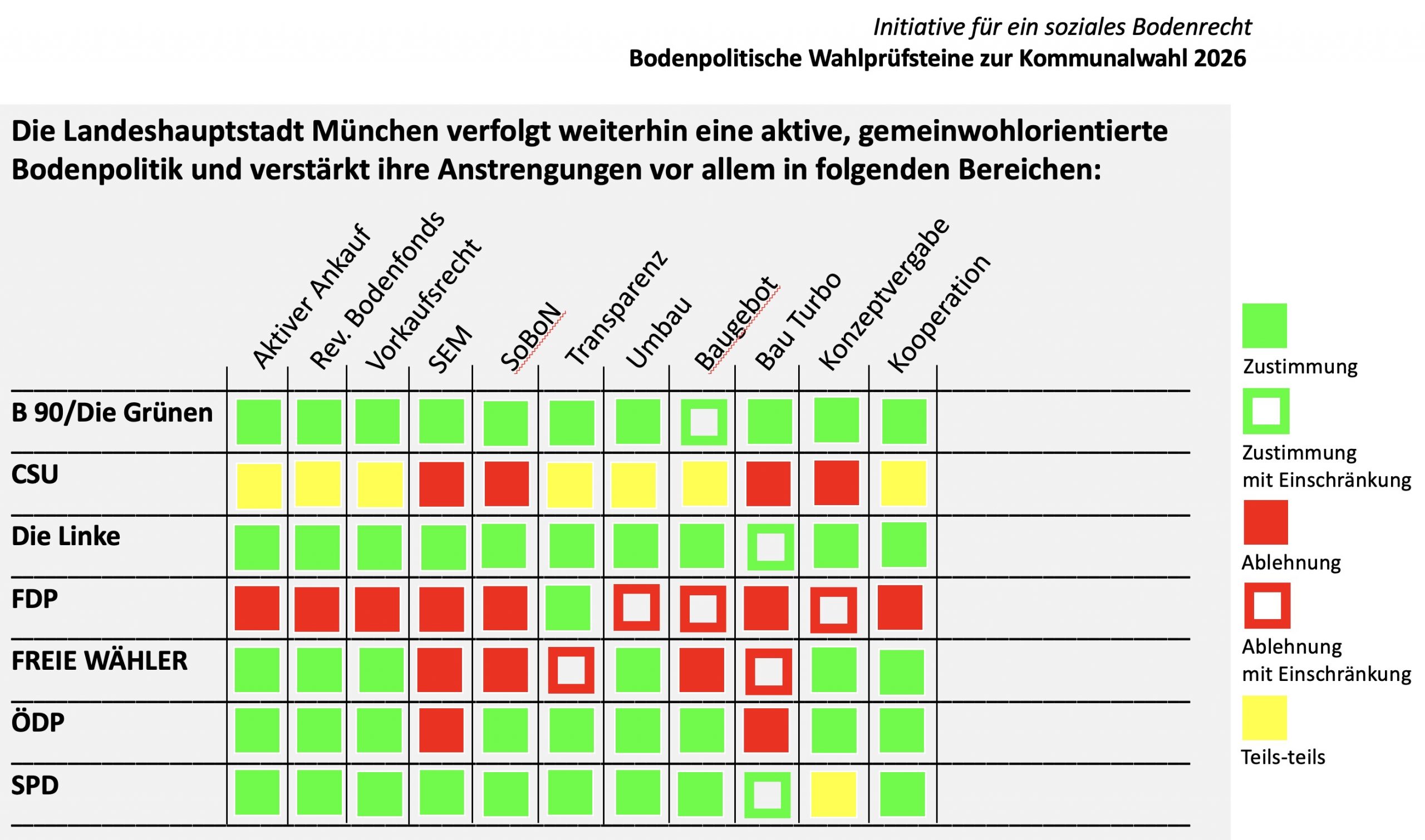 Das 2020 im Vorfeld der Bundestagswahl 2021 gegrün- dete bundesweite Bündnis Bodenwende (https://dasl.de/ ausschuss-bodenpolitik/) hatte angesichts der gesellschaftspolitischen Brisanz und Komplexität des Themas als ersten Schritt „die Einrichtung einer Enquete-Kommission zur gemeinwohlorientierten Bodenpolitik in der nächsten Legislaturperiode unter Einbeziehung von Expert*innen aus Wissenschaft, kommunaler Praxis und Zivilgesellschaft, begleitet von einer breit zugänglichen, öffentlichen Debatte“ gefordert (Bündnis Bodenwende 2021: 1). Leider fand diese Forderung keinen Eingang in den Koalitionsvertrag und kurz vor dem Ende der Legislaturperiode sind nicht einmal Spurenelemente einer Bodenwende auszumachen. Zumindest die beiden größeren Koalitionsparteien, SPD und Bündnis 90/Die Grünen hatten sich noch 2021 in ihren Wahlprogrammen direkt oder indirekt zu einer gemeinwohlorientierten Bodenpolitik bekannt und angekündigt, die Bodenspekulation einzudämmen, das Vorkaufsrecht zu erweitern sowie den schon seit langem diskutierten Planungswertausgleich einzuführen oder mindestens zu prüfen.